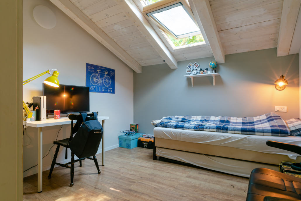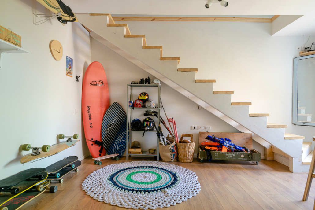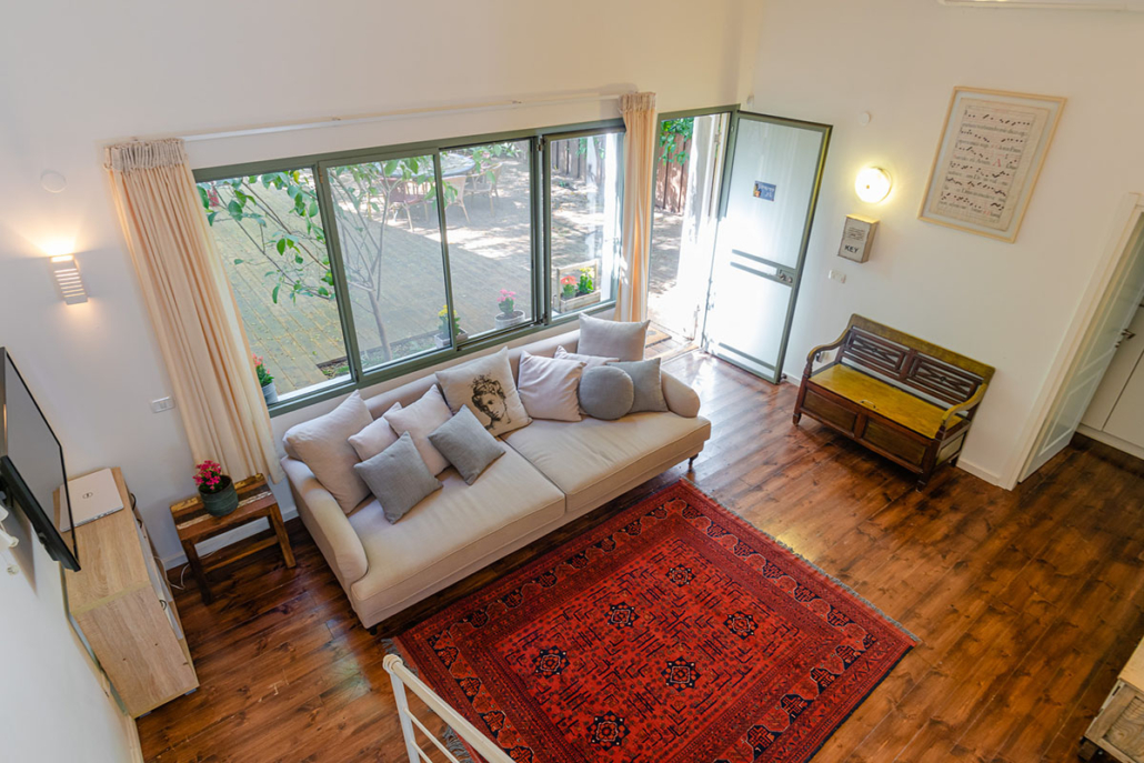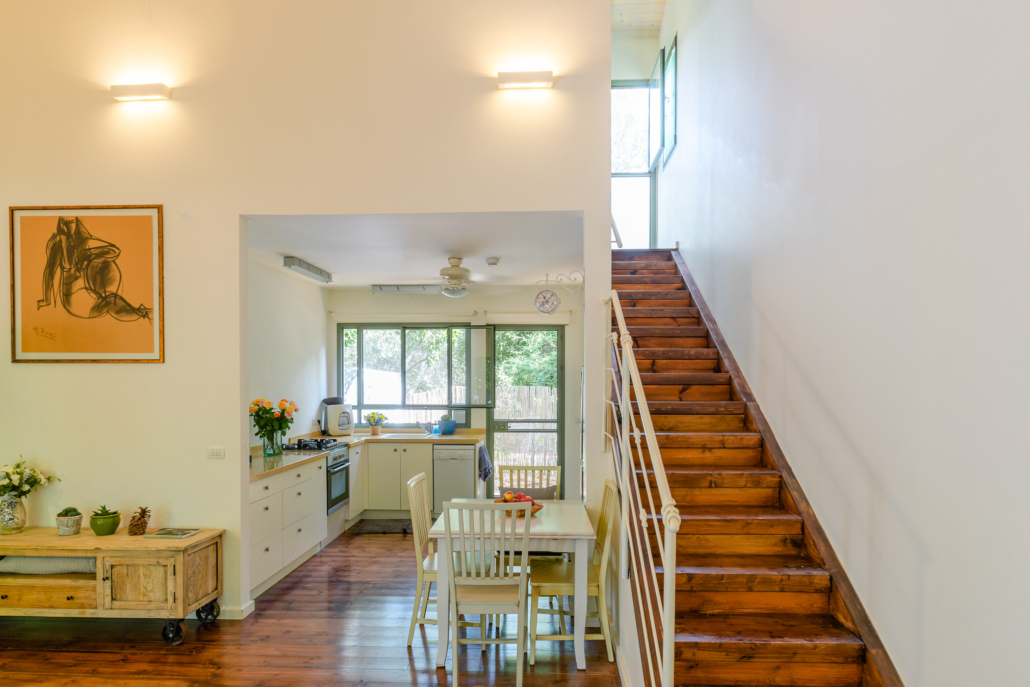 כ-80 מטרים רבועים המתפרשים על שתי קומות, עם חלל כפול ומואר בסלון עם תקרת עץ יפה.